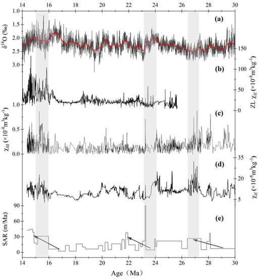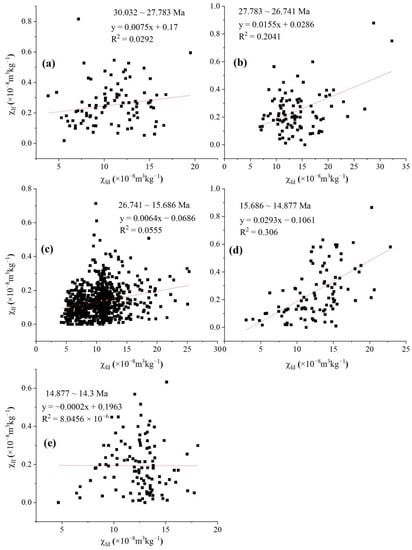 Figure 6 shows that the low-frequency magnetic susceptibility (χlf) of Hongzhuang section fluctuates between 2.9 × 10−8 and approximately 32.3 × 10−8 m3/kg, and the high-frequency magnetic susceptibility(χhf) fluctuates between 2.9 × 10−8 and approximately 31.5 × 10−8 m3/kg, and the overall fluctuation trend and microscopic trough peaks are very similar. At the same time, there are obvious high value areas near 27 Ma, 24 Ma and 15 Ma, and there is a step-like rapid downward trend around 23.8 Ma (Figure 6a,b). Compared with the good corresponding relationship between χhf and χlf, the corresponding relationship between frequency magnetic susceptibility (χfd) and the percentage content of frequency magnetic susceptibility (χfd%) and low frequency magnetic susceptibility (χlf) is not obvious, and the percentage content of frequency magnetic susceptibility (χfd%) and frequency magnetic susceptibility (χfd) is relatively low, the change trend is not obvious, and some values approach or equal to zero (Figure 6c,d). This indicates that the content of superparamagnetic particles affecting the magnetic strength of the Hongzhuang section is very small [29]. However, from the piece-wise linear fitting plot of low frequency susceptibility (χlf) and frequency susceptibility percentage content (χfd%), it can be seen that there are obvious differences in the contribution rate of superparamagnetic particles in different periods (Figure 7). The linear fitting relationship between magnetic susceptibility and frequency magnetic susceptibility at approximately 27 Ma and 15 Ma (Figure 7b,d) is significantly improved compared with other stages (Figure 7a,c,e). It shows that the contribution rate of superparamagnetic particles increased significantly in these two periods. It can also be found in Figure 6a,c that the frequency magnetic susceptibility and magnetic susceptibility increase synchronously at approximately 27 Ma and 15 Ma. Superparamagnetic particles are closely related to soil formation. The higher the temperature and humidity of the climate, the longer the duration, the more fine-grained ferromagnetic minerals are formed. On the Chinese Loess Plateau, the frequency magnetic susceptibility of paleosol is higher and the frequency magnetic susceptibility of loess is lower and shows a positive correlation with the change in magnetic susceptibility [36]. The frequency magnetic susceptibility, which has a clearer indication of paleoclimate, can not only reflect the large-scale climate change similar to the magnetic susceptibility record, but is also sensitive to the weak climate fluctuation that cannot be clearly indicated by the magnetic susceptibility [37]. It is considered to be an ideal proxy index to reflect the intensity of soil formation. Therefore, we believe that the increase in correlation coefficient R2 and frequency magnetic susceptibility at approximately 27 Ma and 15 Ma represents the increase in superparamagnetic particles and the enhancement of soil formation.