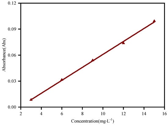 In this study, a UV-3600 ultraviolet–visible spectrophotometer was used to measure the adsorption capacity of dodecylamine on the sphalerite surface in the wavelength range of 100 nm to 600 nm. Dodecylamine solution with a concentration of 15.0 mg·L−1 was prepared for spectrum scanning to find the wavelength of its characteristic absorption peak, and the result is shown in Figure 2. The subsequent measurements were all carried out at a wavelength of 204 nm. Dodecylamine solutions with concentrations of 3.0 mg·L−1, 6.0 mg·L−1, 9.0 mg·L−1, 12.0 mg·L−1, and 15.0 mg·L−1 were prepared and we measured the absorbance at a pH of around 12.0. These data were linearly fitted to obtain the standard curve of absorbance and concentration of the dodecylamine solution. As shown in Figure 3, the standard absorption equation is: