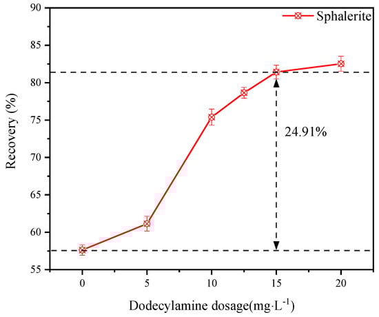 The effect of dodecylamine dosage on the flotation of sphalerite was explored and the results are shown in Figure 4; the pH was 6.36 when any agent was not added. It was concluded that the recovery of sphalerite increased obviously with an increase in the dosage of dodecylamine. When the dosage of dodecylamine reached 15.0 mg·L−1 or above, the recovery of sphalerite was stable at around 81.63%. It could be proposed that dodecylamine could be used as an effective collector for sphalerite flotation.