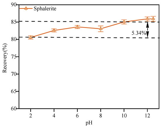 When the dosage of dodecylamine was set at 15.0 mg·L−1, the effect of pH on the flotation recovery of sphalerite was explored, and the results are shown in Figure 5. It could be deduced that a good floatability of sphalerite was achieved when the pH was changed within a wide pH range from 2.0 to 12.0. The flotation recovery of sphalerite tended to increase with the increase in pH, and a recovery of 86.81% was reached when the pH was about 12. It could be inferred that the adsorption of dodecylamine was basically not affected by the pH of the pulp. Therefore, when the pH of the solution was low, even below the point of zero charge (the mineral surface was positively charged), sphalerite still maintained good floatability, and the recovery of sphalerite was relatively high even in a strongly acidic environment. It could be concluded that dodecylammonium ions () or dodecylamine molecules () in solution were chemisorbed on the sphalerite’s surface [19].