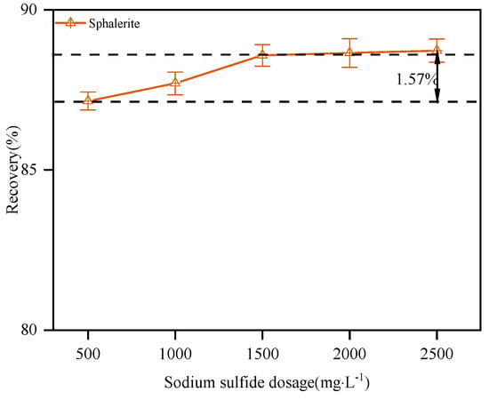 The effect of sodium sulfide dosage on the flotation of sphalerite was explored under the following conditions: the dosage of dodecylamine was 15.0 mg·L−1 and the pH value of the slurry was controlled at about 12.0. It could be seen from Figure 6 that the dosage of sodium sulfide had little effect on the flotation recovery of sphalerite, and a weak activation effect was obtained. When the dosage of sodium sulfide was greater than 2000 mg·L−1, the flotation recovery of sphalerite was basically stable at about 88.87%. In the flotation system with dodecylamine as a collector, excessive sodium sulfide did not inhibit sphalerite as in the xanthate flotation system. This provided a prerequisite for the simultaneous flotation of zinc-containing mixed sulfide and oxide minerals.