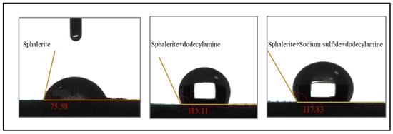 Figure 9 shows the contact angle changes of sphalerite powders pretreated with DI water, dodecylamine, and/or sodium sulfide + dodecylamine, respectively. The contact angle of natural sphalerite powders was 75.58°, which proved that sphalerite had a certain hydrophobicity [21,22]. The contact angle of the sphalerite surface pretreated with dodecylamine was 115.11°, which meant that the addition of dodecylamine improved the hydrophobicity of sphalerite, and the dodecylamine adsorbed on the surface of sphalerite increased the floatability of minerals. The contact angle of sphalerite pretreated with sodium sulfide + dodecylamine was 117.83°, which indicates that the addition of sodium sulfide improved the hydrophobicity of the sphalerite’s surface, which is also consistent with the flotation results for sphalerite.