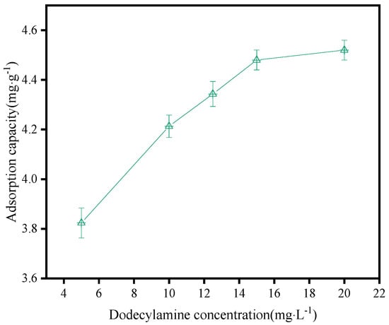 The amount of dodecylamine absorbed on the sphalerite surface was measured at the dodecylamine concentrations of 3.0 mg·L−1, 6.0 mg·L−1, 9.0 mg·L−1, 12.0 mg·L−1, and 15.0 mg·L−1, respectively. The results are shown in Figure 10. This indicated that with the increase in dodecylamine concentration, the amount of dodecylamine adsorbed on the surface of sphalerite gradually increased, but when the dodecylamine concentration increased to 15.0 mg·L−1, the adsorption amount curve tended to flatten. This result is consistent with the results of the effect of dodecylamine dosage on the flotation of sphalerite, as shown in Figure 4.