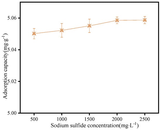 The effect of the sodium sulfide dosage on the adsorption quantity of dodecylamine on the surface of sphalerite was also studied with a concentration of dodecylamine of 15.0 mg·L−1, and the results are shown in Figure 11. The adsorption quantity of dodecylamine on the sphalerite surface increased slightly with the increase in sodium sulfide dosage. The adsorption quantity did not change significantly when the sodium sulfide dosage increased to 2000 mg·L−1. Sodium sulfide had no depressing effect on the adsorption of dodecylamine on the sphalerite’s surface, which is consistent with the results of the flotation tests for sphalerite.