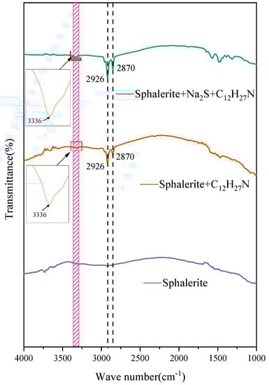 The infrared spectra of sphalerite under different chemical conditions in a highly alkaline environment are shown in Figure 12. No characteristic peaks were found on the natural sphalerite’s surface in the wavenumber range from 4000 cm−1 to 1000 cm−1. The obvious characteristic absorption peaks appeared at 2870 cm−1 and 2926 cm−1 when the sphalerite adsorbed the dodecylamine. The characteristic peak at a wavenumber of 2870 cm−1 was caused by symmetric stretching vibration, and the characteristic peak at a wavenumber of 2926 cm−1 was the absorption peak of antisymmetric stretching vibration [23,24]. The absorption peak in the infrared spectra after the interaction between dodecylamine and sphalerite was characteristic of physical adsorption. It could be proposed that dodecylamine is physically adsorbed onto the surface of sphalerite in a highly alkaline environment. The infrared spectroscopy showed that an absorption peak caused by amino stretching vibration appeared at around 3336 cm−1 when dodecylamine interacted with sphalerite, which may have been caused by the change in electron density in dodecylamine, indicating that dodecylamine underwent strong physical adsorption on the surface of the sphalerite. This adsorption may have been caused by the hemimicelle adsorption of amine molecules and their ionic dimers; in addition to the electrostatic attraction, there was also a certain degree of van der Waals force [25]. After adding sodium sulfide, both absorption peak areas of and stretching vibration showed a certain increase, indicating that the electron density of N in the amine molecule had changed, which may have been caused by the bonding between S and the Zn site on the surface of the sphalerite.