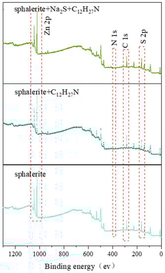 XPS tests were used to verify the interaction mechanism between dodecylamine and the sphalerite’s surface. The relevant measured spectra and relative atomic amounts on the sphalerite surfaces, with binding energies ranging from 0 to 1200 eV, are shown in Figure 13 and Table 2, respectively. The results show that the main elements on the surface of the sphalerite powders studied in this paper were C, S, Zn, and N, with no obvious impurities. The contents of C and N obviously increased after adding dodecylamine, which indicated that the adsorption of dodecylamine molecules on the sphalerite’s surface occurred. The amount of S on the sphalerite’s surface decreased by 1.81%, and the amount of Zn decreased by 3.74% after adding sodium sulfide and dodecylamine, compared with the natural sphalerite powders. The combination of and anions dissolved from the sphalerite with and cations dissolved from the dodecylamine under alkaline conditions mainly caused in this phenomenon [26]. The change in the amount of N shows that dodecylamine was adsorbed on the surface of sphalerite. The amine adsorbed on the surface of sphalerite increased with the increase in dodecylamine concentration under highly alkaline conditions. To further identify the surface differences between the samples before and after the adsorption of sodium sulfide and dodecylamine, the fitting of Zn, S, and C peaks was conducted.