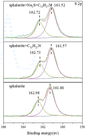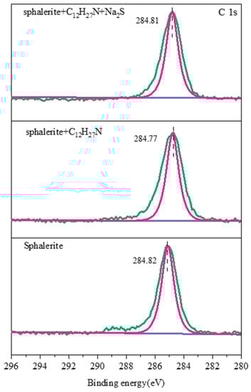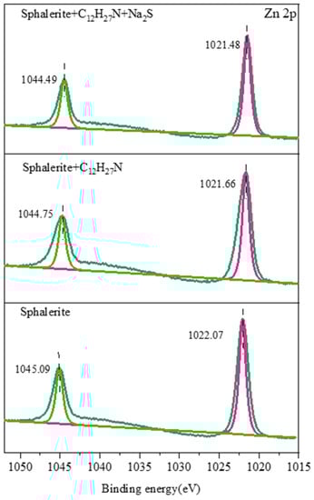 It can be seen from Figure 14, Figure 15 and Figure 16 that the characteristic peak of C 1s on the sphalerite surface at 284.82 eV was caused by the hydrocarbon pollution that was pre-adsorbed on the surface of the sphalerite [27], and this was also the standard peak used for calibrating all the XPS data. Only one S 2p doublet was found on the surface of the sphalerite, with an S 2p3/2 binding energy of 161.80 eV and an S 2p1/2 binding energy of 162.98 eV. This suggests that sulfur is only present in the S2− species on natural sphalerite [28]. The binding energy of the Zn 2p3/2 characteristic peak was 1022.07 eV [29]. The C 1s of the sphalerite pretreated with dodecylamine changed slightly due to the absorption of dodecylamine molecules [30]. The chemical shift of sulfur in the sphalerite pretreated with dodecylamine indicates that these two sulfur components were present in different chemical environments. The loss of electrons or bonding to more electronegative atoms led to this phenomenon [25]. The shift in Zn 2p could have arisen because the chemical state of Zn changed, and the N atom in dodecylamine formed a relatively stable complex with Zn2+ on the sphalerite’s surface, after which chemical adsorption occurred. Zn 2p, S 2p, and C 1s shifted slightly after the addition of sodium sulfide, indicating that sodium sulfide had a certain activation effect on the sphalerite in the dodecylamine system, instead of an inhibiting effect.