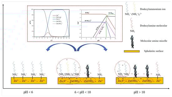 Based on the XPS spectra, it could be inferred that there were many components on the sphalerite’s surface. This might be because various redox reactions occurred on the sphalerite’s surface, and this resulted in different products when the pH was adjusted. Combined with the flotation results, it could be seen that the floatability of sphalerite was enhanced when the pH was greater than 10. It is speculated that this is because dodecylamine played a role in both chemical adsorption and physical adsorption on the sphalerite’s surface [31]. In addition to the electrostatic adsorption on the electric double layer, the association between the amine ion and the non-polar group of the molecule as well as the van der Waals force between the hydrocarbon chains caused by the hemimicelle adsorption also played important roles in the physical adsorption. The adsorption mechanism is shown in Figure 17.