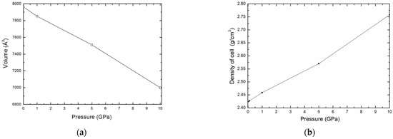 In the first time, the sample was equilibrated with the NPT ensemble. We performed simulations to obtain the variation of volume and density of the kaolinite structure as a function of pressure, P, for a temperature T = 300 K. For a given pressure, the points obtained corresponding to volume and density are shown in Figure 3a,b, respectively. We may see that the density of kaolinite structure increases with increasing pressure.