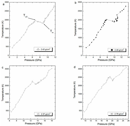 Computed isochore curves for ρ = 2.42 (a), 2.46 (b), 2.57 (c), and 2.76 (d) g/cm3, with to the corresponding melting points and superheating limit temperature.