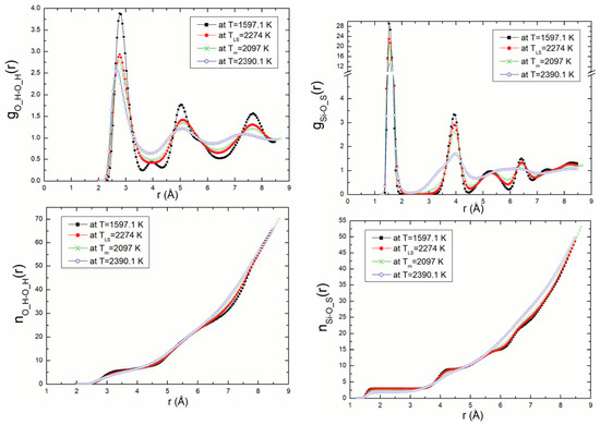 Radial distribution functions (RDF) and coordination number, n(r), were calculated for all atom pairs. As an example of this, the Si-O_S (silicon—surface oxygen) and O_H-O_H (oxygen—oxygen) RDF with temperature and their related coordination numbers are presented in Figure 5. In this figure, we show the RDF for density ρ = 2.57 g/m3 (P = 13.32 GPa) at different temperatures 1597.1 K, TLS = 2274 K, 2097 K, Tm = 1818 K, and 2390.1 K corresponding to temperatures on the solid branch, the superheating limit temperature, the melting point and the temperature on the branch liquid, respectively. These results are compared to those obtained from the DM calculations using the Z-method [9].