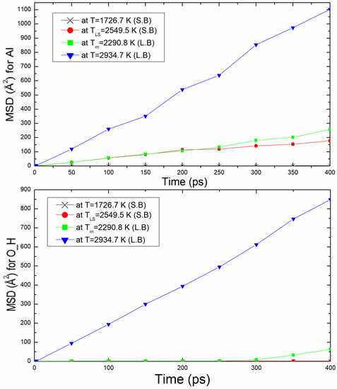 As we may see, the diffusion coefficient is significantly higher in the liquid branch than in the solid branch. A significant increase in the diffusion coefficient is noticed in the liquid isochore branch. Table 4 shows the diffusion coefficient values for all atoms, Al, Si, O_A, O_S O_H, and H at different temperatures for ρ = 2.76 g/m3. The value of its diffusion coefficient for Al in the liquid isochore branch obtained from the slope of MSD in Figure 6, D = 4.73 × 10−9 m2/s, is in good agreement with those obtained for the liquid diffusion.