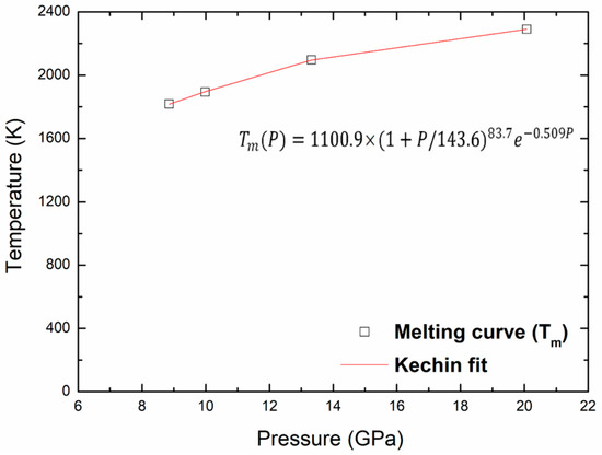 Finally, the points of the melting curve obtained in this work were fitted using a unified equation, proposed by Kechin for the melting curve at high pressure [36,37]. The melting equation is given as follows: