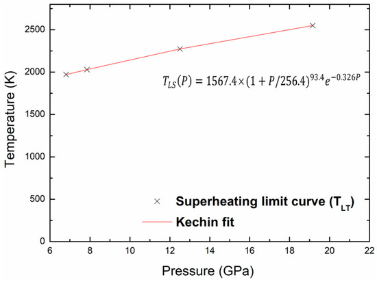 Superheating limit temperature and Kechin fit curves for kaolinite with pressure.