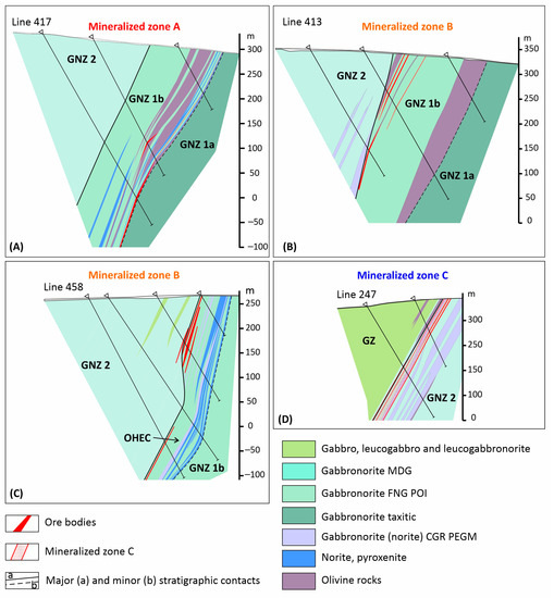 Schematic geological sections through the PGE zones of the East Pana intrusion: PGE zone A (A), PGE zone B (B,C), PGE zone C (D). GNZ, gabbronorite zone; GZ, gabbro zone, OHEC, Ore Horizon of the East Chuarvy deposit; FNG, fine-grained; MDG, medium-grained; CGR PEGM, coarse-grained to pegmatoid; POI, poikilitic. Lines of geological profiles and their location within the areas are shown in Figure 1. Modified after [50].