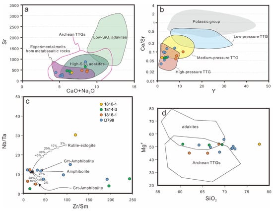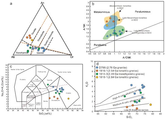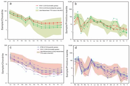 - Huang, X.L.; Niu, Y.; Xu, Y.G.; Yang, Q.J.; Zhong, J.W. Geochemistry of TTG and TTG-like gneisses from Lushan-Taihua complex in the southern North China Craton: Implications for late Archean crustal accretion. Precambrian Res. 2010, 182, 43–56. [Google Scholar] [CrossRef]