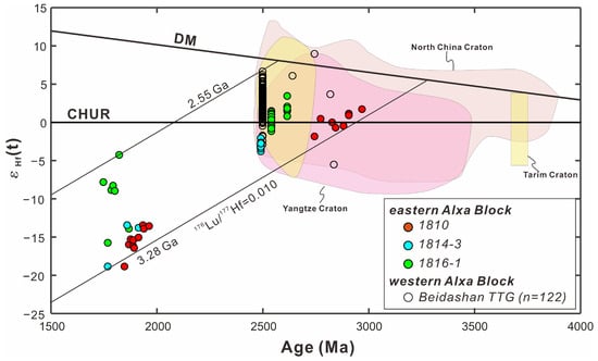 Niu, P.; Qu, J.; Zhang, J.; Zhang, B.; Zhao, H. Archean Crustal Evolution of the Alxa Block, Western North China Craton: Constraints from Zircon U-Pb Ages and the Hf Isotopic Composition. Minerals 2023, 13, 685. https://doi.org/10.3390/min13050685