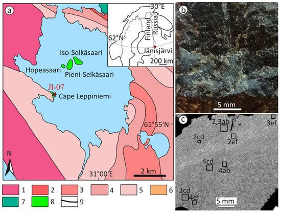 Schematic geological map with the geographical location in inset map of the Jänisjärvi structure (a), sample Jl-07 (b) and a BSE image of polished thin section of the sample (c). Crater position is marked with red circle; sampling location of Jl-07 is marked with red asterisks; 1—Pälkjärvi formation; 2–5—Naatselkä formation (2—undivided, 3—lower, 4—middle and 5—upper); 6—Early/Middle Proterozoic rocks; 7—gabbrodiabase; 8—impactites; 9—faults. Modified after [31]. Annotations in (c) describe the corresponding figures.