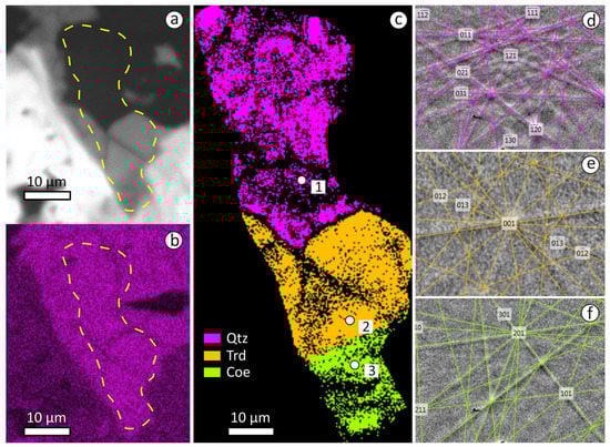 CL image (a), EDS map of Si distribution (b), phase EBSD map (c) of quartz, tridymite and trace coesite; (d–f)—indexed Kikuchi patterns of quartz (1), tridymite (2) and coesite (3) marked in (c). Yellow dotted line shows the EBSD mapping region.