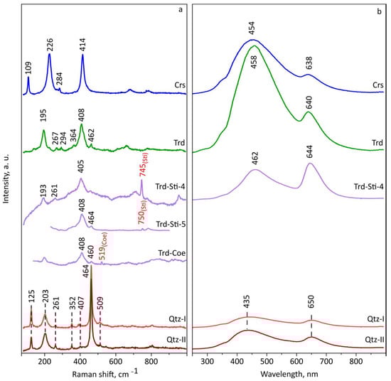 Raman (a) and CL (b) spectra of cristobalite (Crs), tridymite (Trd), tridymite with traces of stishovite (Trd-Sti) and coesite (Trd-Coe) and α-quartz (Qtz I, Qtz II). Spectra of stishovite traces taken from point (4) and from region (5) shown in Figure 7.