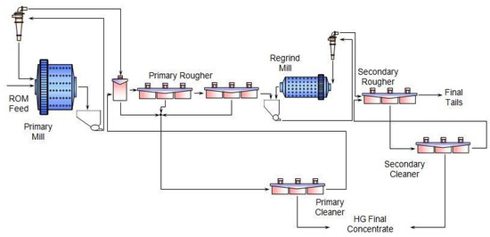 South Africa supplies almost 80% of the world’s platinum group elements (PGE) demands, contributing significantly to the economy of the country because of a massive resource deposit called the Bushveld Complex, BC [1,2]. The PGEs are extracted from three mineralised horizons, namely the Merensky, UG-2 and Plat reefs. The flotation efficiency of platinum group minerals (PGM) ores using conventional mechanical cells is hugely dependent on liberation. Conventional comminution circuits, comprising a cone crusher, high-pressure grinding roll (HPGR) and ball mill, targeting a primary grind of 80% passing 75 µm, are energy-intensive, as the finer the product size, the higher the energy consumption rate [3,4,5]. Fine grinding leads to the sliming of PGMs and BMS (base metal sulphides) due to overgrinding, thereby resulting in losses. Some PGM operations implement staged grinding utilising a complex mill, float, mill, float (MF2) circuit, as shown in Figure 1, in order to prevent overgrinding. A number of PGM concentrators implement flash flotation to recover coarse liberated PGMs and BMS in the hydrocyclone underflow stream, before recycling them back to the mill.