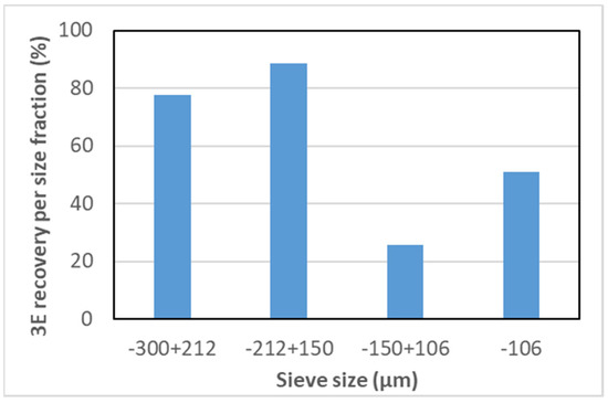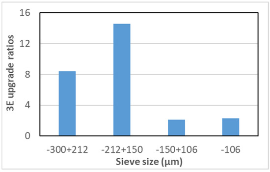 Figure 8 shows that the highest 3E recovery was observed for the +150 − 212 µm, followed by the +212 − 300 µm particle size fractions. Figure 9 shows that the 3E upgrading ratios were higher in the coarse (+150 − 300 µm) size fraction than in the fine (−150 µm) size fraction. 3E had the highest upgrading ratio in the +150 − 212 µm size range. The HF separator achieved a relatively lower 3E recovery and upgrading ratio for the fine (−150 µm) size fraction. The relatively low upgrading ratio of the fine particles could be attributed to entrainment of fine gangue, which dilutes the concentrate. The relatively lower 3E recovery in the fine size fraction could be attributed to the hydrodynamic conditions prevailing in the HF separator, which favour the recovery of coarse and not fine particles. Finer particles would require high energy input, and maybe higher collector dosages and deeper froth depth; all these conditions do not exist within the HF environment [34].