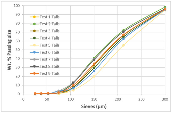 The particle size distribution (PSD) of the +106 − 300 µm size fraction was characterised, and the results are presented in Figure 3.