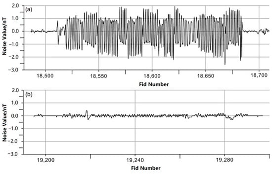 To address the magnetic interference of the CH-3 FUAV, we propose a solution and modify the system to eliminate and weaken static EM interference. Firstly, we measured the background field of the FUAV and installed the magnetometer at the wingtip where the magnetic field gradient is the smallest. Secondly, we checked and replaced all replaceable interference parts with nonmagnetic materials such as pure copper and plastic screws. Finally, we used comprehensive technologies such as EM shielding, electrical isolation, and weak magnetization of interference sources. Figure 3 shows an example of the magnetic interference of the FUAV before and after the magnetic field weakening. The noise level dropped to near zero, indicating that our methods can effectively reduce the magnetic interference of the FUAV.