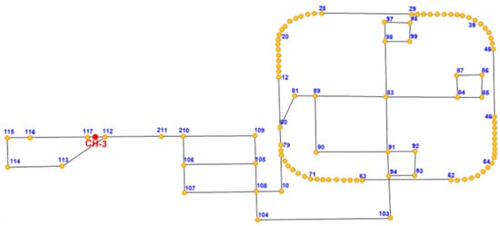 Sketch map of the magnetic compensation track of the FUAV aeromagnetic system. The yellow points represent the track control points, the figures are the index number of these control points for inputting into the flight control system, and the red point represents the starting and ending positions of the CH-3 FUAV.