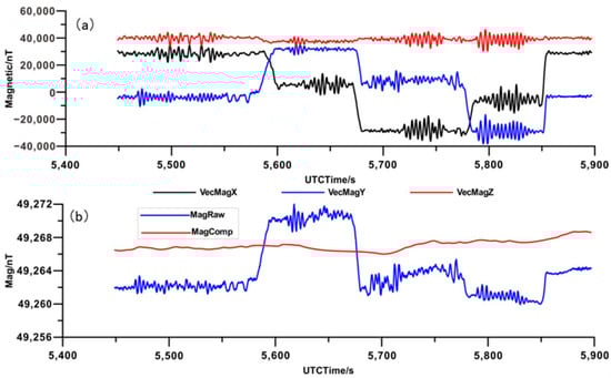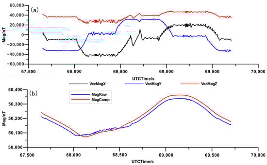 The magnetic compensation test of the MUH aeromagnetic system. (a) Amplitude of X component (VecMagX), Y component (VecMagY), and Z component (VecMagZ) of the magnetic field; (b) comparison of the magnetic field before compensation (MagRaw) and after compensation (MagCopm).