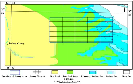 The aeromagnetic survey in a tidal flat area in Jiangsu province in China. The blue rectangle represents the survey area, the black lines in the east–west direction represent the survey lines, and the black lines in the south–north direction represent the crosslines.