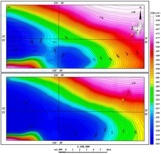 Comparison of TMI contour maps after IGRF correction of the aeromagnetic survey between the (a) FUAV and (b) MUH aeromagnetic systems. Arrow A points to the magnetic anomalies that may be caused by the windmills.