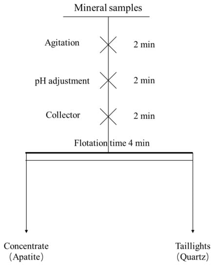 The micro-flotation tests of single minerals and artificial mixed minerals were conducted at an XFGⅡ-5 laboratory flotation machine (Jilin Exploration Machinery Plant, Changchun, China) with a 40 mL flotation cell; the impeller spindle speed was 1992 r/min. The flotation process is shown in Figure 2. A mass of 2 g single mineral sample or artificially mixed minerals samples (the mass ratio of apatite: quartz was 3:2) and 30 mL deionized water were placed into the flotation cell, then the pulp pH was adjusted to a predetermined pH (if required) and conditioned for 2 min, followed by addition of the collector, and again conditioned for 2 min before flotation. The flotation scraping time was 4 min, and the concentrates and tailings were separately filtered, dried, and weighted, and the grade of P2O5 in concentrates was assayed.