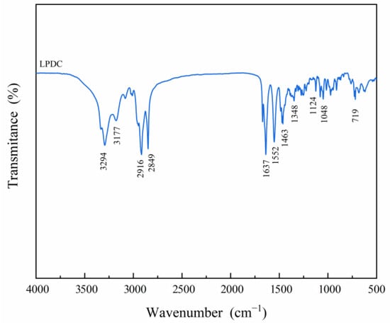 FTIR, 1HNMR and MS were used to characterize the structure of LPDC. The FTIR spectrum of LPDC is shown in Figure 3. It can be seen that the characteristic peaks at 3294 cm−1 and 3177 cm−1 were the stretching vibration of N-H in NH4+ [37]. The peaks at 2916 cm−1, 2849 cm−1 1463 cm−1, 1348 cm−1 and 719 cm−1 were referred to the asymmetrical stretching vibration, symmetric stretching vibration, bending vibration, in-of-plane wagging vibration and out-of-plane wagging vibration of -CH2-, respectively. The peaks at 1637 cm−1 and 1552 cm−1 were attributed to the stretching vibration of C=O and the C-N-H bending vibration, respectively [38,39]. The peak at 1124 cm−1 was referred to the stretching vibration of C-C. The peak at 1048 cm−1 was referred to the stretching vibration of C-OH. The 1HNMR spectrum analysis of LPDC indicated that 1HNMR (400 MHz, CDCl3): δ ppm 5.59 (s, 1H, NH(CONH)), δ 4.03 (s, 1H NHR2+), δ 3.59 (dt, J = 11.4, 4.9 Hz, 6H, 3 CH2), δ 3.25 ppm (s, 6H, 2 CH3), δ 2.20 ppm (q, J = 8.0 Hz, 2H CH2), δ 2.10–1.49 ppm (m, 4H, 2 CH2), δ 1.24 ppm (d, J = 7.6 Hz, 18H, 9 CH2), and δ 0.86 ppm (t, J = 6.6 Hz, 3H, CH3). The MS (ESI+): calculated for C19H41N2O2+ 328.48; found 329.13 [M+H]. The characterization showed that the synthesized product was the target product.