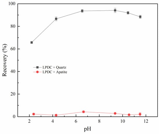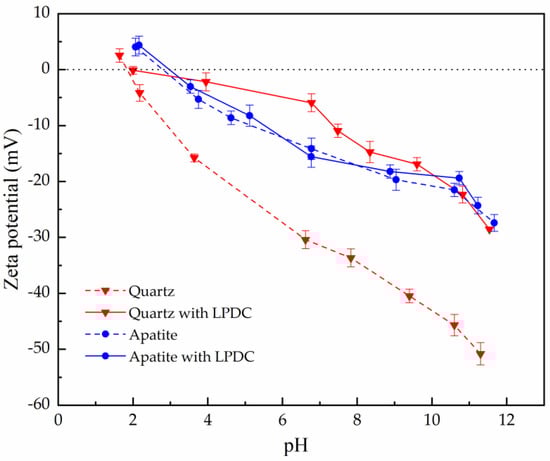 As can be seen in Figure 9, under the same pulp pH environment, the zeta potentials of quartz are more negative than those of apatite in the test range. The point of zero charges (PZC) of quartz and apatite are 1.9 and 2.9, respectively [15,44], which is in accordance with those previously reported. When the pulp pH increases, the zeta potential of both quartz and apatite gradually decreases. It can be clearly seen that there is a significant shift in the surface potential of quartz to a more negative zeta potential after the LPDC treatment; however, the zeta potential of apatite only fluctuates in a small range and no regular shift occurs. From the results, it can be conducted that the adsorption of LPDC is primarily on the quartz surface.