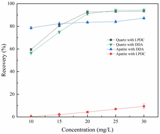 Effect of LPDC and DDA concentration on the flotation behaviors of quartz and apatite at natural pulp pH.