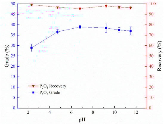 Figure 6 shows the effect of pulp pH on the flotation of artificially mixed minerals with 25 mg/L LPDC. Since the apatite desilication process was a reverse flotation process, the apatite concentrate was left in the flotation cell. It can be seen that with the increase in pulp pH, the grade of apatite concentrate showed a trend of first decreasing and then slightly decreasing; however, its recovery always remained at a high level. At the natural pulp pH, the apatite concentrate reached a maximum grade of 38.94% (the P2O5 grade of the apatite sample was 39.94%) and the recovery was 95.45%. This indicated that the LPDC has excellent separation efficiency on quartz and apatite under natural pulp pH.