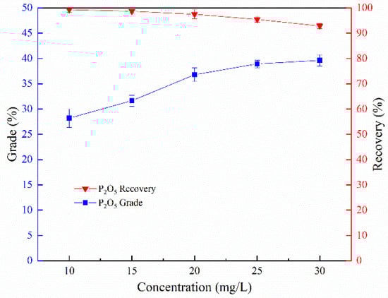 The effects of LPDC concentration on the flotation artificially mixed minerals of quartz and apatite at the natural pulp pH were investigated; the results are displayed in Figure 7. It can be seen from Figure 7 that at an LPDC concentration from 10 mg/L to 30 mg/L, the recovery of apatite gradually decreased while its grade gradually increased, due to some of the apatite being entrained and floated out during the collecting of the quartz. When the LPDC concentration was at 25 mg/L, the apatite recovery reached 95.45%, and the grade of the apatite concentrate was 38.94%. Continuing to increase the LPDC concentration not only decreased the grade of apatite but also decreased its recovery. So, it can be conducted that the optimal concentration of LPDC for separating apatite and quartz artificially mixed mineral is 25 mg/L. The LPDC has the potential to become an effective collector for apatite desilication.