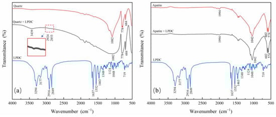 FTIR can be used to determine the functional groups of substances by their characteristic peaks [40]. The FTIR can not only investigate and analyze the structure of compounds, but also can be used in the field of flotation to analyze and study the adsorption mechanism between flotation reagent and mineral surface. The FTIR spectra of quartz and apatite before and after treatment with LPDC at the natural pulp pH are shown in Figure 8.