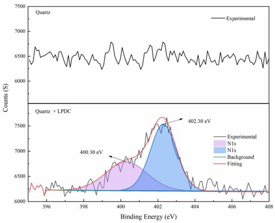 From Table 1, it can be seen that pure quartz only contains three elements of C (due to the exposure of the samples to the air, carbon-containing contaminants were formed), O, and Si. After treatment with LPDC, the relative atomic concentration of the representative atoms on the quartz surface changed, where the N element was detected. As can be seen in Figure 10, two N1s signals on the LPDC-treated quartz surface were observed at 402.3 eV and 400.3 eV, which were assigned to N in the first anchored adsorption layer and the higher (second, third, etc.) layers, respectively [45], and indicates that the adsorption of LPDC occurred on the quartz surface.