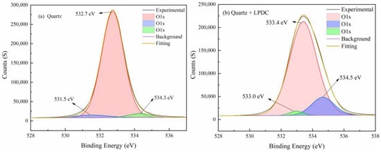 From Figure 11, peaks in the binding energy of 531.5 eV, 532.7 eV, and 534.3 eV on the pure quartz surface were detected, which were attributed to the element O in Si-OH, and Si-O-/Si-O-Si, respectively [24,45]. After LPDC treatment, the signals of the binding energy of O1s had been changed to 533.0 eV, 533.4 eV, and 534.5 eV. These shifts indicated that the adsorption of LPDC may have broken the original bonds and formed new hydrogen bonds on the quartz surface. The negatively charged Si-O- on the quartz surface could be combined with RNH4+ of LPDC in the solution by electrostatic attraction. Furthermore, the binding energy shifts of O1s are also affected by the hydrogen bond (Si-OH…N-R, Si-O…HO-R) [34,46]. The XPS results were agreement with the results of the analysis obtained by FTIR and zeta potential.