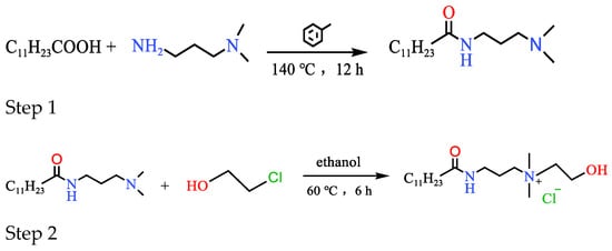 A two-step synthesis of LPDC was carried out in the laboratory; the synthesized routes are shown in Scheme 1. Firstly, a three-necked flask containing 0.10 mol lauric acid, 20 mL toluene, and a magnetic stirrer was placed in an oil bath. The system was heated to 100 °C to ensure the lauric acid had completely dissolved. Then, the 0.15 mol 3-(Dimethylamino)-1-propylamine was added dropwise slowly to the three-necked flask through a pressure-equalizing funnel (approximately 3 h for dropwise completion). After that, continued to be heated at 140 °C and reacted for 12 h. With the reaction complete, the toluene and excess 3-(Dimethylamino)-1-propylamine were evaporated under reduced pressure. The crude product was recrystallized by petroleum ether 2 times, followed by drying in a vacuum oven for 24 h to obtain the target product of the first step—(Laurylamidopropyl)dimethylamine (DPLA).