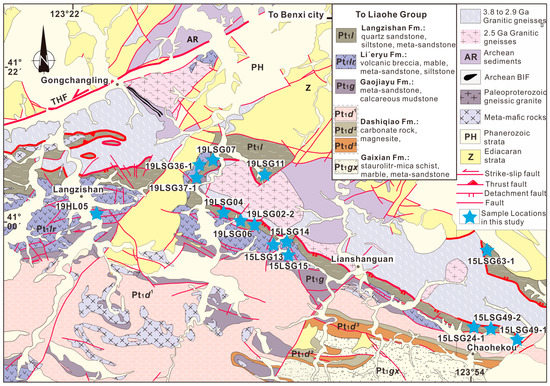 The study area is situated in the Lianshanguan region of eastern Liaoning Province (Figure 2), which is characterized by the widespread exposure of the Archean basement and Paleoproterozoic strata, including the North Liaohe Group, a minor amount of Neoarchean supracrustal rocks (Anshan Group in Anshan-Benxi Area Liaoning), Paleoproterozoic igneous rocks, and Phanerozoic strata (Figure 2 and Figure 3) [64,65,66].