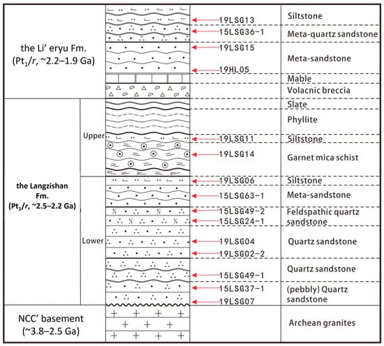 The (meta-)sedimentary rocks in the Langzishan and Li’eryu formations from the North Liaohe Group were chosen for detrital zircon LA-ICP-MS U-Pb dating, and these included (pebbly) quartz sandstones (19LSG07, 15LSG37-1, 15LSG49-1, 19LSG02-2, and 19LSG04), feldspathic quartz sandstones (15LSG24-1 and 15LSG49-2), meta-sandstone (15LSG63-1), siltstones (19LSG06 and 19LSG11), and garnet mica schist (19LSG14) from the Langzishan Fm. Furthermore, the meta-sandstones (19HL05-2 and 19LSG15), siltstone (19LSG13), and quartz sandstone (15LSG36-01) from the Li’eryu Fm. were also included (Figure 2 and Figure 3). The petrographic features of representative samples are outlined below (Only representative surface samples have been selected for detailed description, and all sample descriptions are available within the Supplementary Materials).