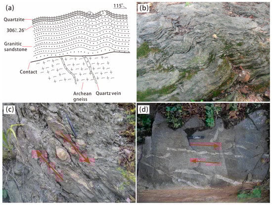 The Archean basement in the Lianshanguan area, mainly consisting of granitic gneisses and migmatites, forms a short-axis, anticline-like dome that stretches approximately 40 km in the NW direction and has a width of 5–10 km [68]. The outer edge of the dome is overlain by the North Liaohe Group and Sinian strata, and an unconformity separates it from the overlying Langzishan Fm., resulting in the formation of a typical weathering paleocrust, particularly in the Sandaoling area. In addition, numerous quartz veins have been developed in the granitic basement and truncated by the unconformity surface (Figure 4a). The granitic conglomerate sandstone—located above—and a medium-sized sandy conglomerate are present. A large-scale ductile shear zone has been developed on the southern edge of the dome (Figure 4b–d). Based on kinematic indicators including asymmetric folds, rotated boudins, and offset markers, the ductile zone shows a dextral shearing sense. The Paleoproterozoic igneous rocks here consist of both deformed felsic granites and mafic rocks with ages ranging from approximately 2.2 to 1.9 Ga [24,51,69,70].