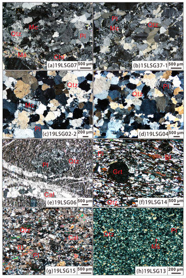 Representative thin-section micrographs of the Langzishan formation and the Li‘leyu formation of the North Liaohe Group. Image (a) is from the sample 19LSG07 (quartz sandstone), (b) is from the sample 15LSG37-1 (quartz sandstone), (c) is from the sample 19LSG02-2 (quartz sandstone), (d) is from the sample 19LSG04 (quartz sandstone), (e) is from the sample 19LSG06 (siltstone), (f) is from the sample 19LSG14 (garnet mica schist), (g) is from the sample 19LSG15 (meta-sandstone), and (h) is from the sample 19LSG13 (siltstone). The abbreviations for the minerals are as follows: Qtz—quartz, Mc—microcline, Pl—plagioclase, Ms—muscovite, Chl—chlorite, Cal—calcite, Grt—garnet, and Bt—biotite.