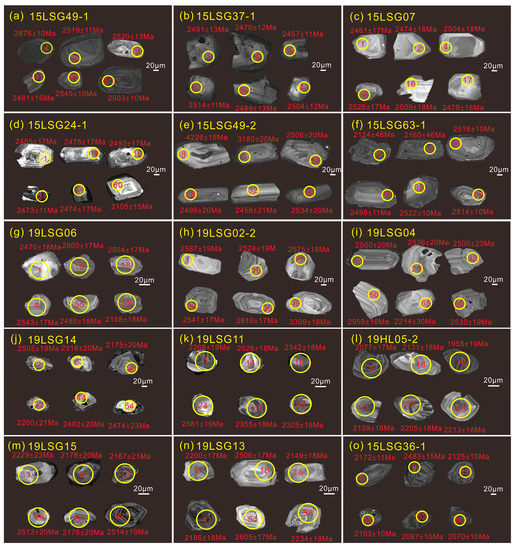 In the Li’eryu Fm., the analysis of zircon grains extracted from different samples of metamorphic sandstone (19HL05, 19LSG15, 15LSG36-1) and siltstone (19LSG13) was conducted. The zircon grains were found to have short columnar or rounded morphology, with aspect ratios less than 2:1, and exhibited oscillatory zoning with Th/U ratios ranging from 0.11 to 1.20, indicating that they were typical magmatic zircons. The 207Pb/206Pb age of these zircon grains ranged from 1846 to 2270 Ma with age peaks at different times depending on the samples. The analysis also revealed older ages for some of the samples, ranging from 2479 to 2605 Ma (Figure 6i–o and Figure 7i–o).