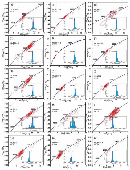 206Pb/ 235U vs. 207Pb/ 238U diagrams and U-Pb age histograms (sub-figure) for the U-Pb detrital zircon analyses of sedimentary rocks from the Lower Langzishan Fm. (a–c), the Upper Langzishan Fm. (d–k) and the Li’eryu Fm. (l–o) of the North Liaohe Group.