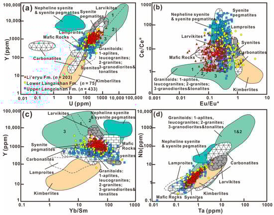 The detrital zircons provide a means of examining the sources of sediments, as their trace element compositions can be analyzed (Figure 9) [96]. The detrital zircons analyzed in the study showed a positive correlation between U and Y concentrations, suggesting derivation from acidic or intermediate acidic igneous rocks such as granite, syenite, and pegmatite. A few zircons from throughout the stratigraphy fall within the field of mafic rocks (Figure 9a,b). The Eu/Eu* distribution range (0.1–1) is more concentrated than that of Ce/Ce* (1–100) in the zircons from the study area, suggesting derivation from granites, nepheline-syenite pegmatites, and pegmatites. The Y concentrations and Yb/Sm display a linear distribution (Figure 9c), suggesting derivation from intermediate-silicic igneous plutons, such as granite, syenite pegmatites, and larvikites, with some zircons derived from mafic rocks. The positive correlation between the Nb and Ta concentrations of these zircons (Figure 9d) suggests derivation from granites, syenites, and mafic rocks, while a few zircons may have originated from carbonatites. Overall, Figure 9 suggests a common derivation for these zircons from intermediate-silicic igneous plutons. The felsic Archean basement of the NCC and the Paleoproterozoic Liao-Ji granites in the JLJB are likely provenances for the Langzishan Fm. and Li’eryu Fm., respectively.