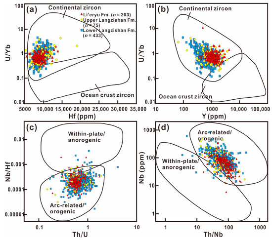 Zircon trace element compositions can provide valuable insights into magmatic, metamorphic, and crustal processes and settings [96,97,98]. We used U/Yb versus Hf and Y diagrams to constrain their tectonic environments. The detrital zircons from both the Langzishan Fm. and the Li’eryu Fm. display similar characteristics when continental and oceanic crustal fields are plotted in, suggesting that they were derived from continental or mixed sources (Figure 10a,b). Additionally, some concordant detrital zircons have been plotted in the arc-related/orogenic fields in the Th/U-versus-Nb/Hf and Th/Nb-versus-Hf/Th diagrams, while a few zircons have been plotted in the within-plate/anorogenic field (Figure 10c,d).